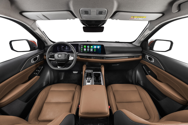 O interior da nova Ram Dakota apresenta muito luxo com painéis de instrumentos e de porta forrados com revestimento premium e materiais macios ao toque, bancos de couro genuíno na cor preta na Warlock – assim como o revestimento das colunas e do teto desta versão – e marrom na Laramie, com ajustes elétricos para os assentos dianteiros.